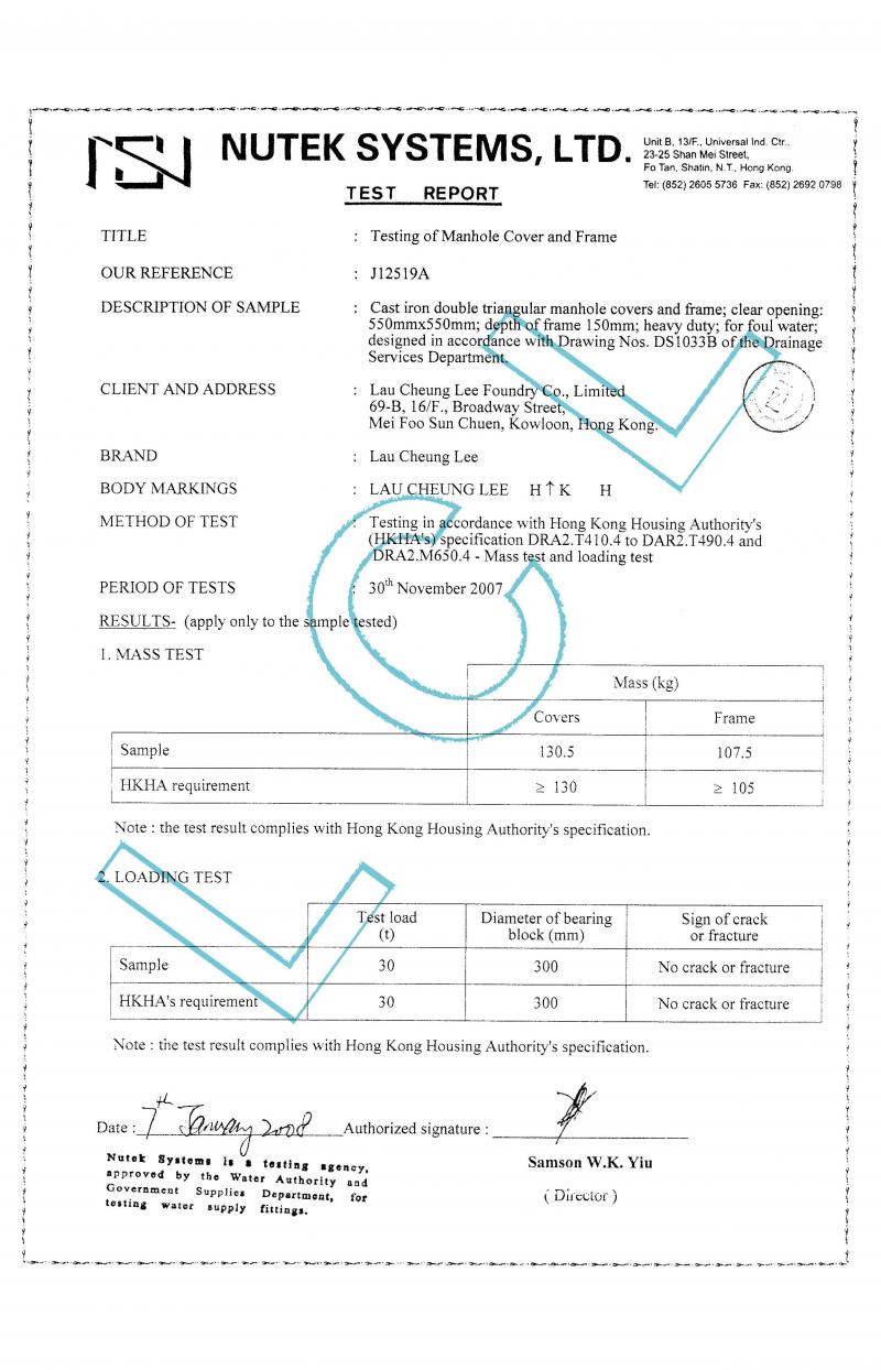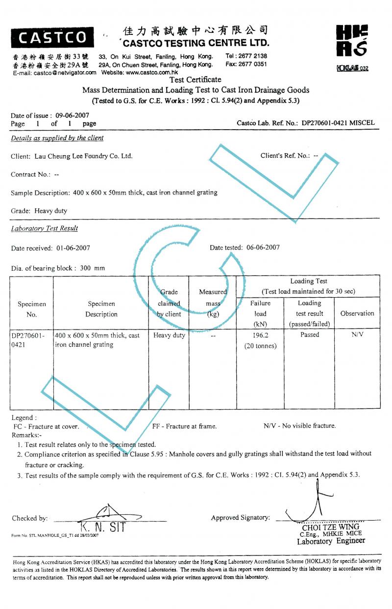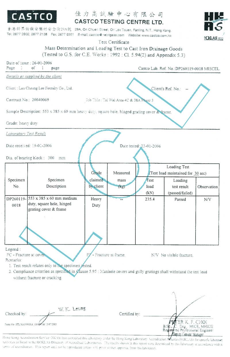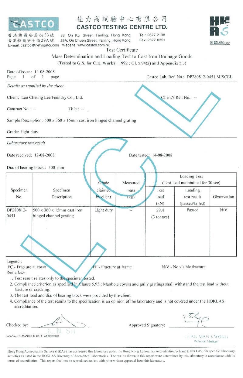K1-450V Cast Iron Kerb Overflow Weirs Certificate
